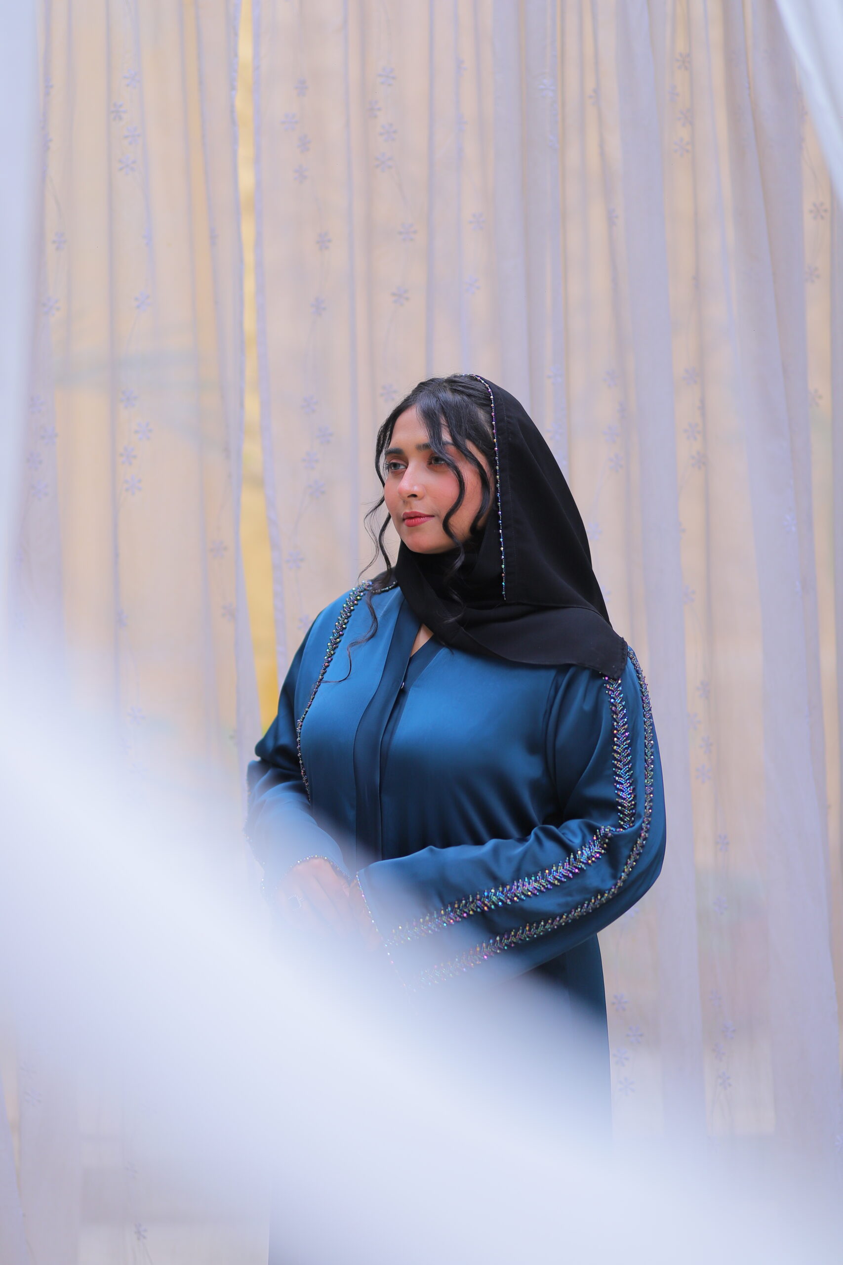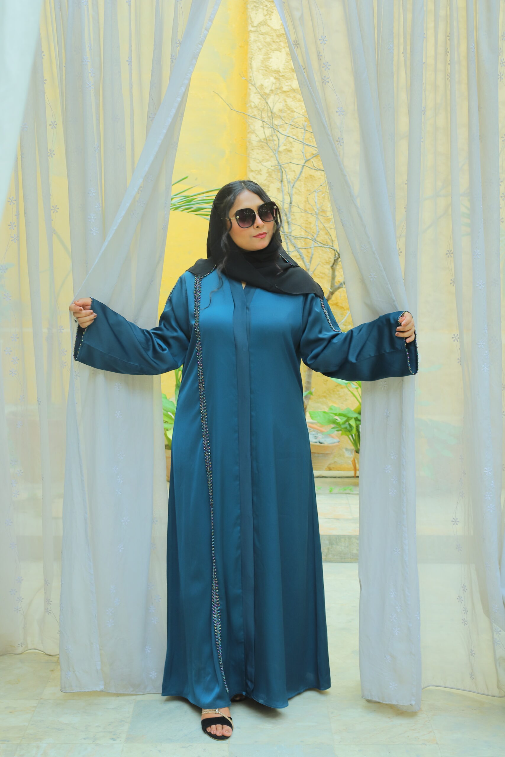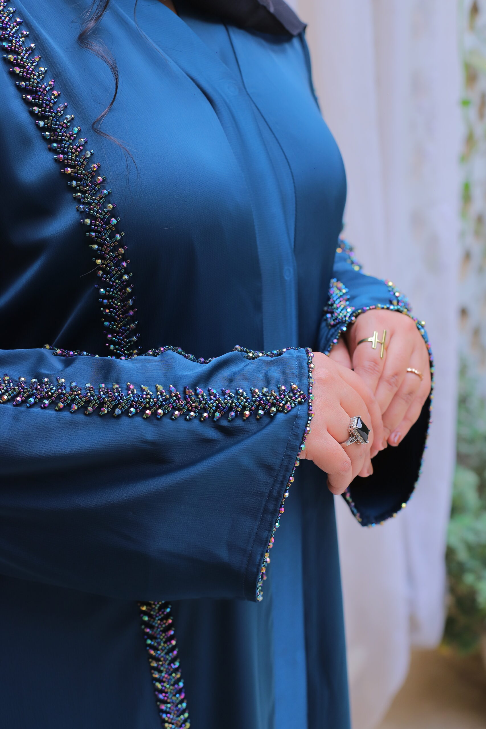 The Zimal Abaya by Allara is a statement piece created for women who appreciate elegance with artisanal detail. Crafted in a rich teal blue shade, this abaya features intricate hand-crafted work along the sleeves, giving it a luxurious yet balanced look.