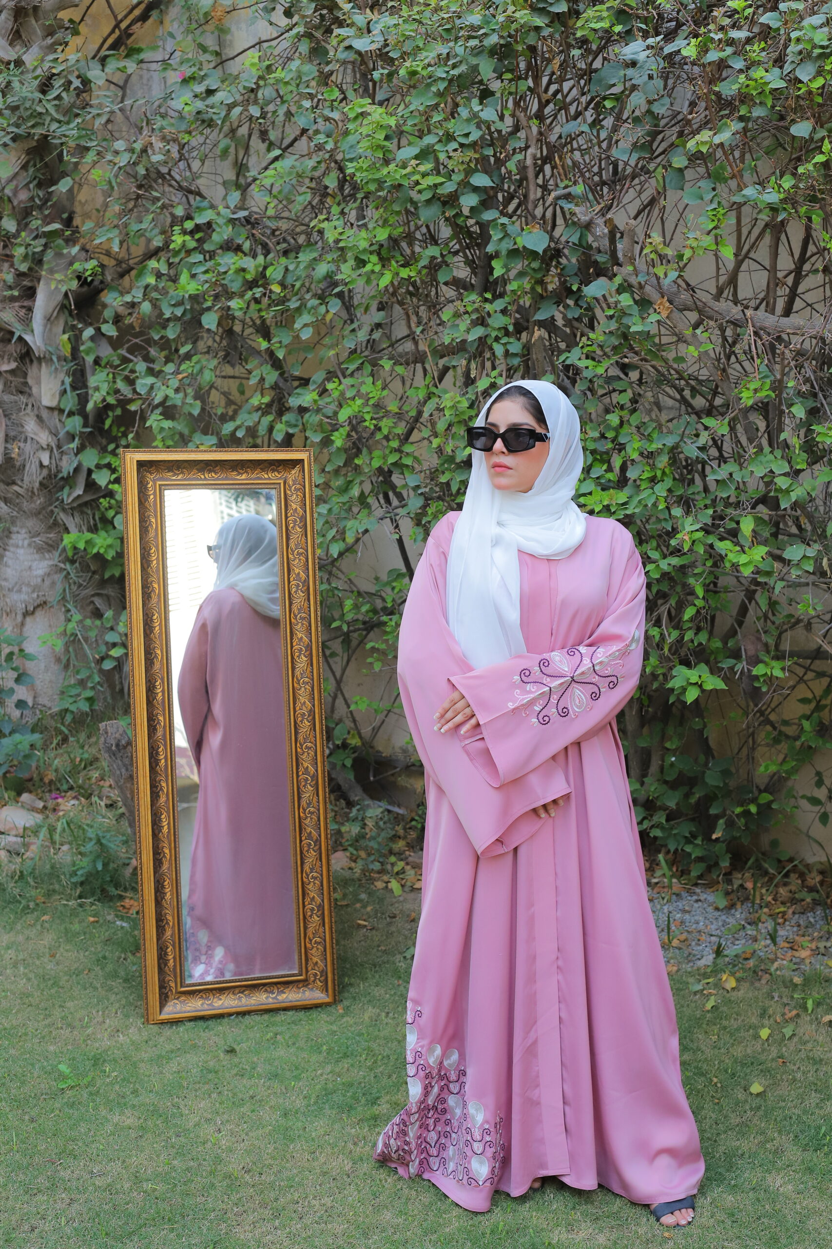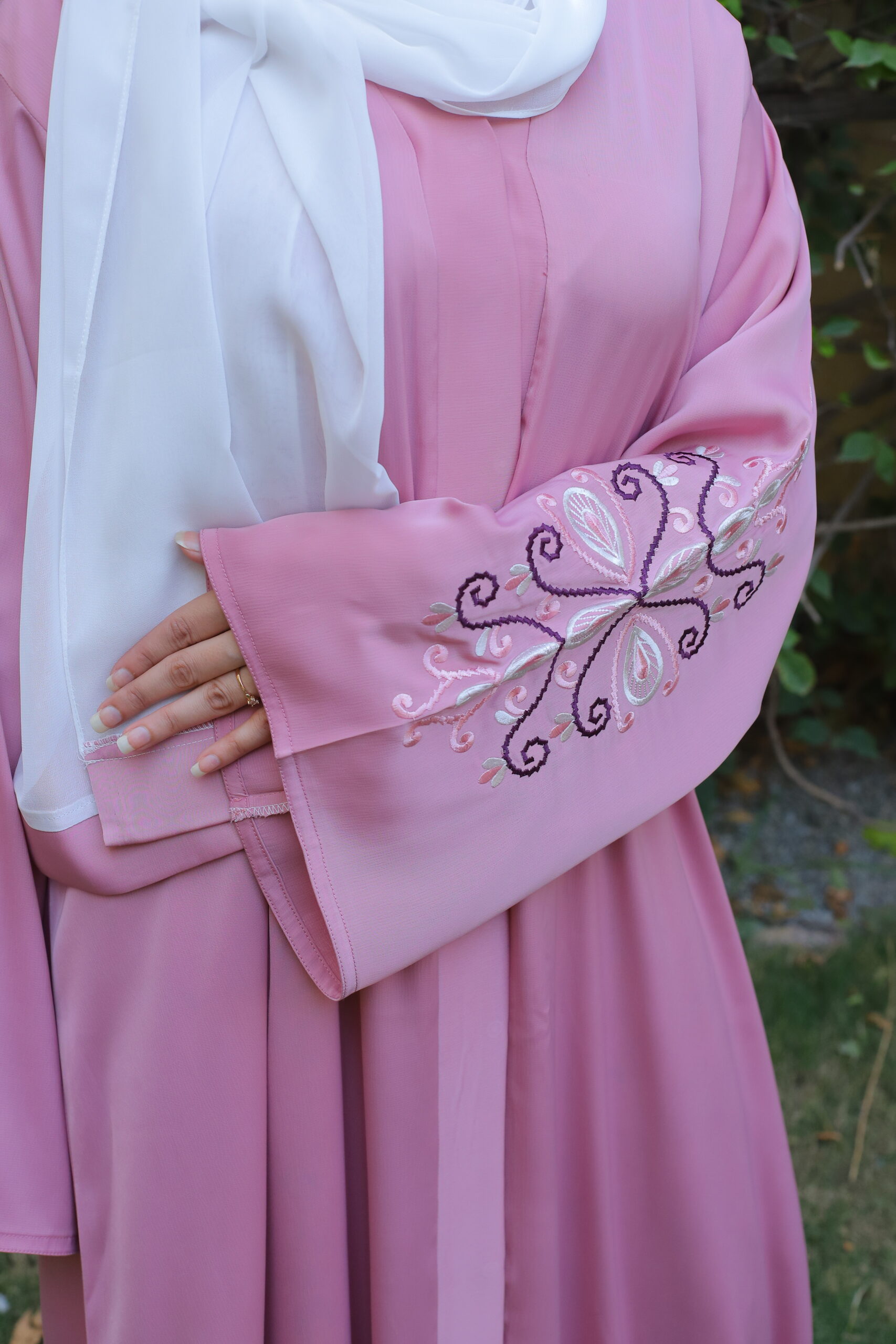 Elegant pink abaya with delicate embroidery on sleeves, designed for modern modest fashion. Lightweight, graceful, and perfect for daily wear or special occasions.